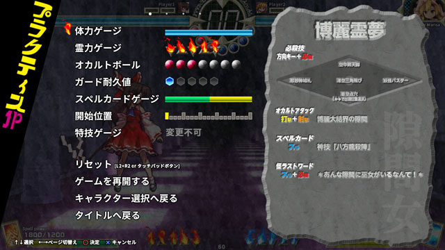 (2P)ページ 1Pと2Pの各種ゲージの量や、リセットしたときのキャラクター初期位置を設定します。