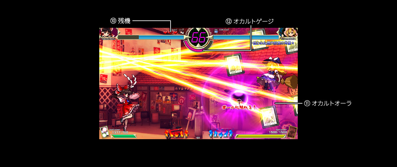 リプレイの保存やクリアタイムの記録ができなくなります。 - ⑪オカルトオーラ怪スペルカード攻撃中に相手キャラやオカルトボールの周囲に現れます。